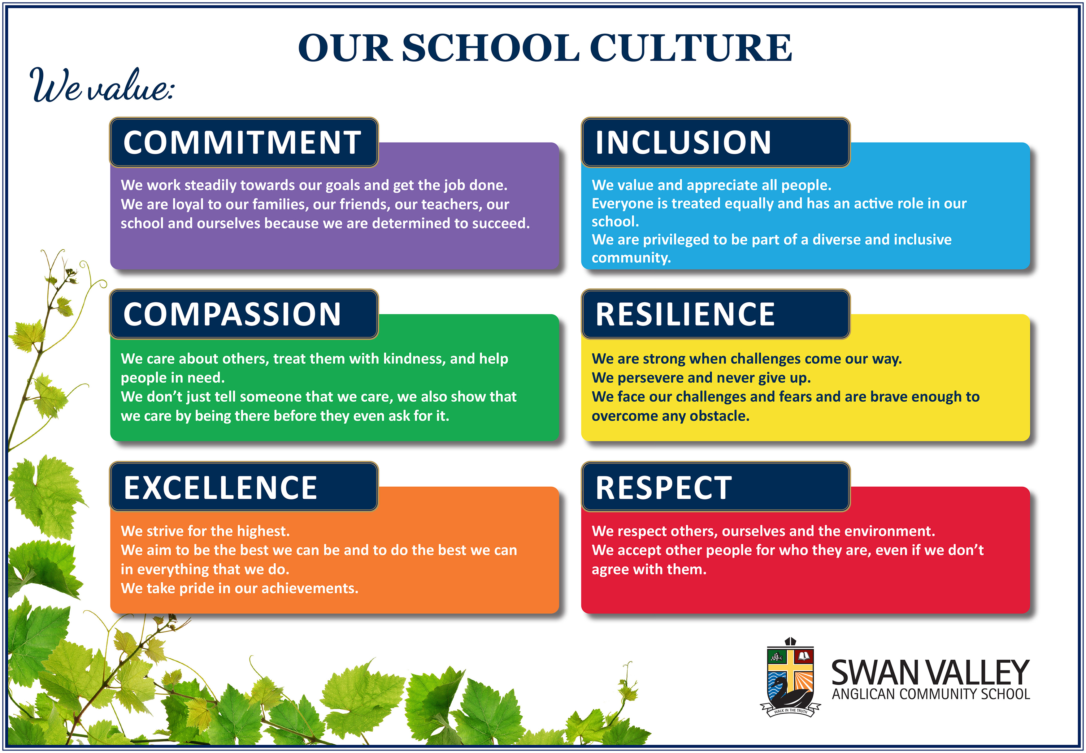 Our students will have integrity and be aspirational, accountable, courageous and community-minded. They will make a positive contribution to humanity.