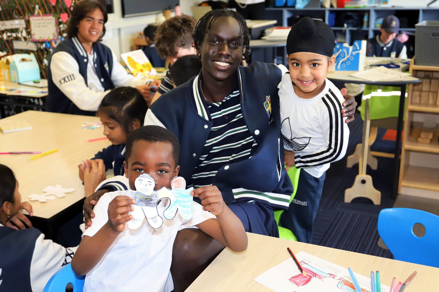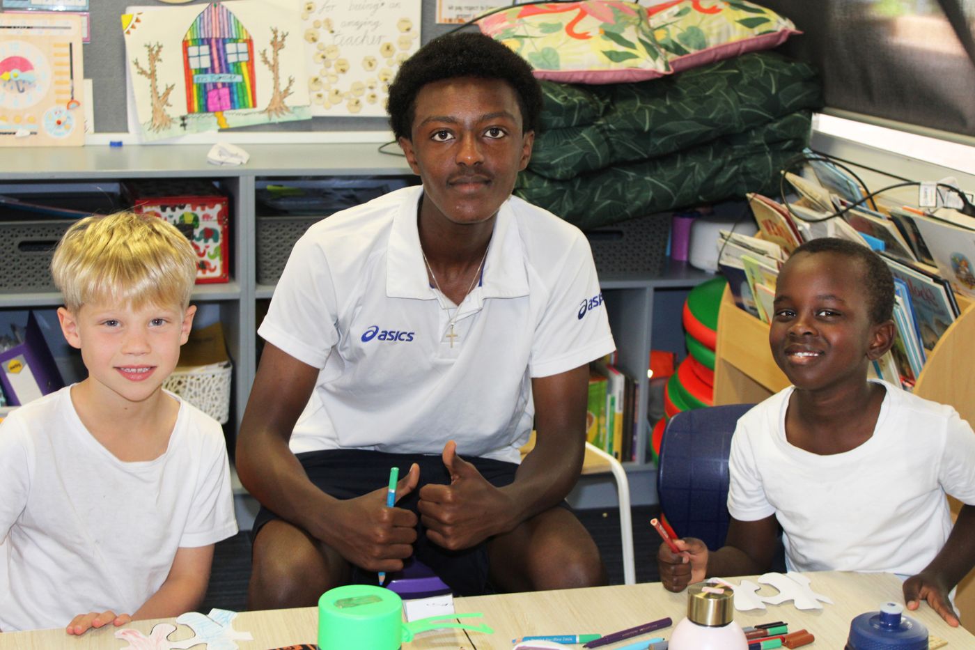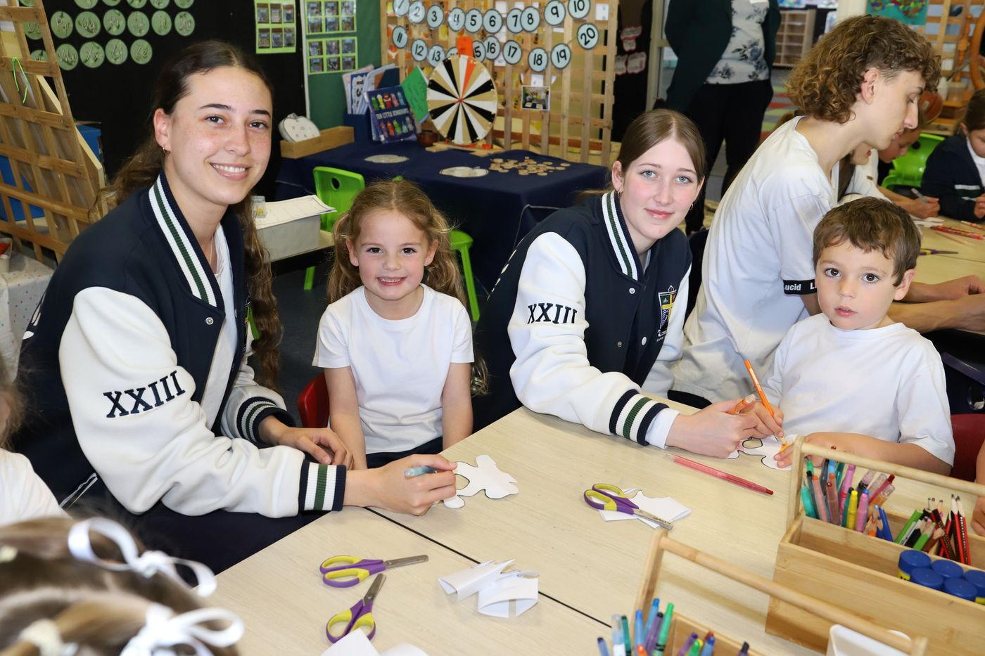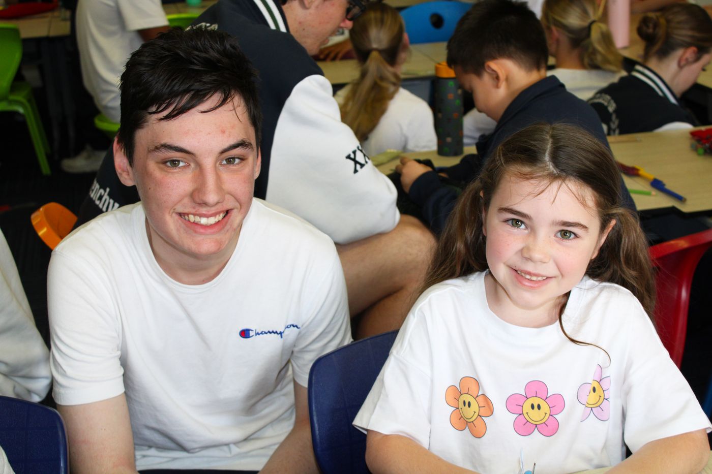 To recognise the National Day of Action Against Bullying and Violence, staff and students wear white t-shirts. Research findings show that strong school community connections and social skills are protective factors in the prevention of bullying. Students from Kindy to Year 12 connect with their buddy classes while doing a colouring activity and having important conversations about bullying.